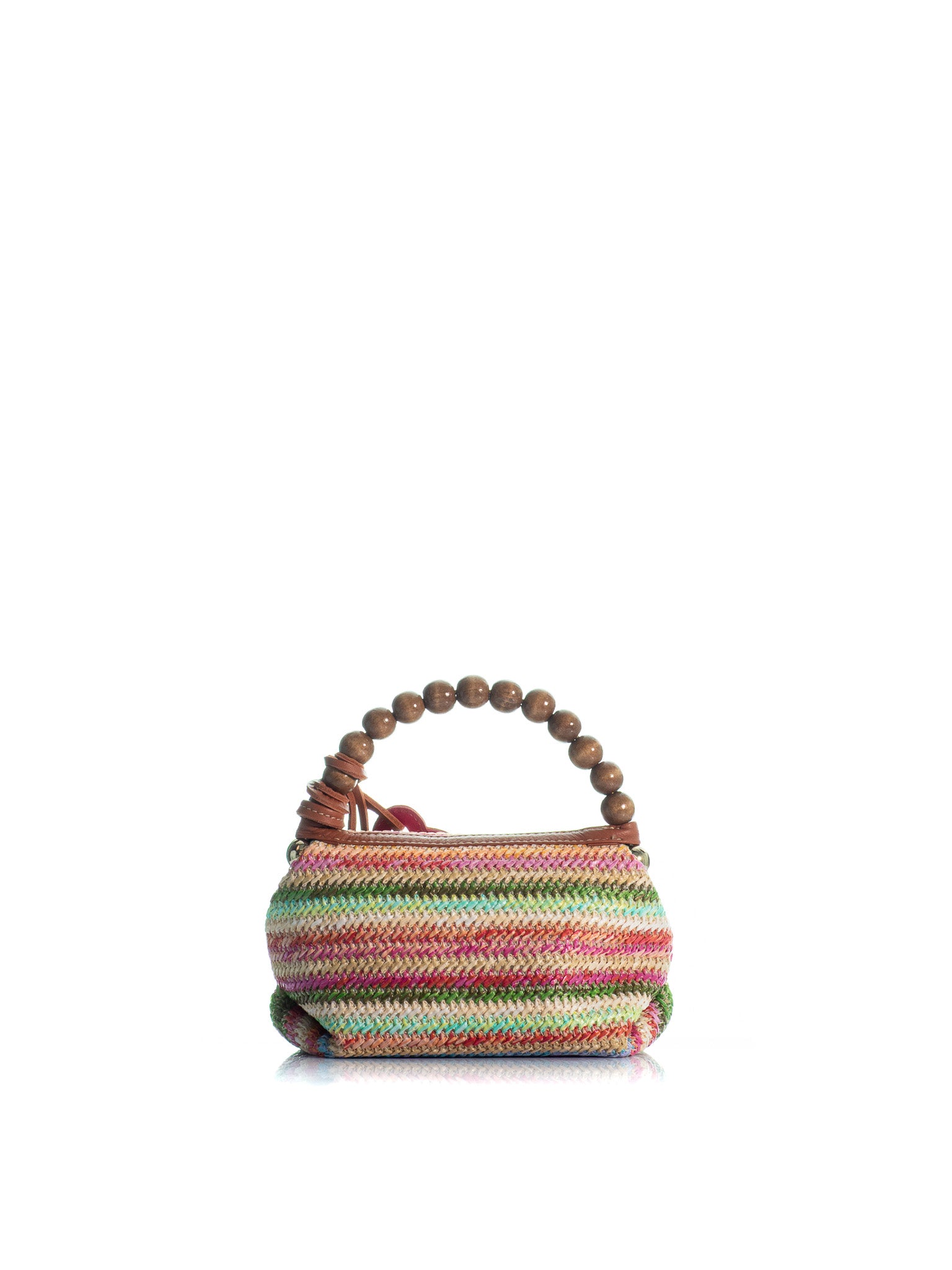 This exclusive piece features a delicate multicolor raffia exterior, beautifully accented by a refined gold-tone metal chain and a uniquely crafted handle made of wooden beads.